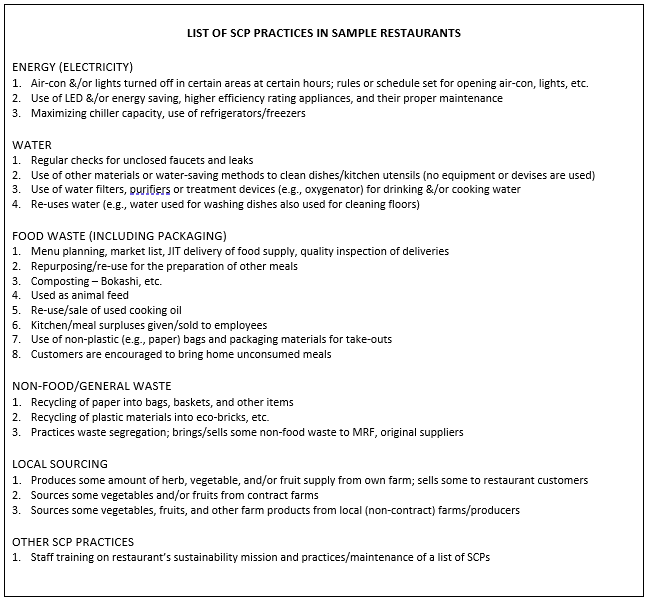The experiences of the WWF Philippines’ partner food service establishments served as key sources of information for the study. These restaurants were in various stages of sustainability practices – those with low awareness of SCP and only starting to apply SCP principles in their operations; those which were aware of the importance of SCP and were in the process of carrying them out; and those where the SCP principles were integrated in their business models.